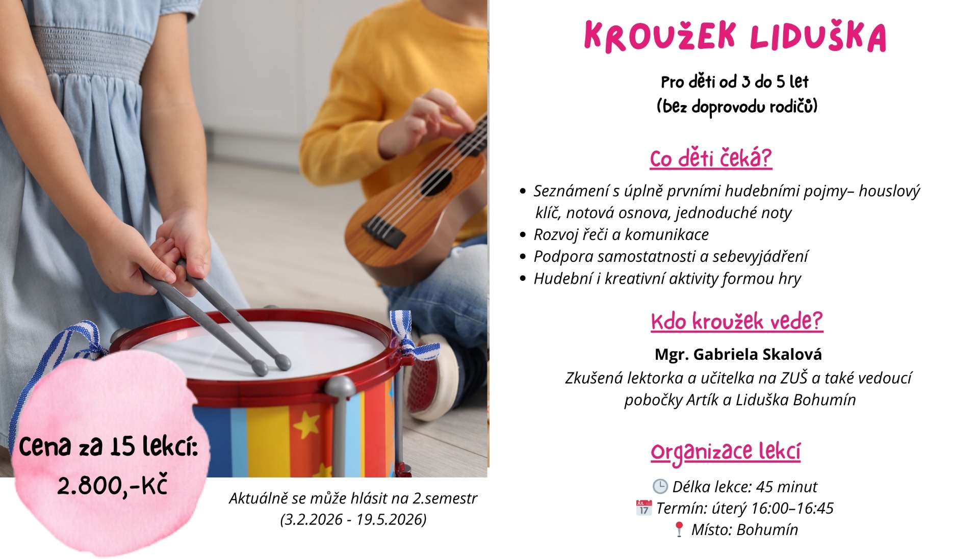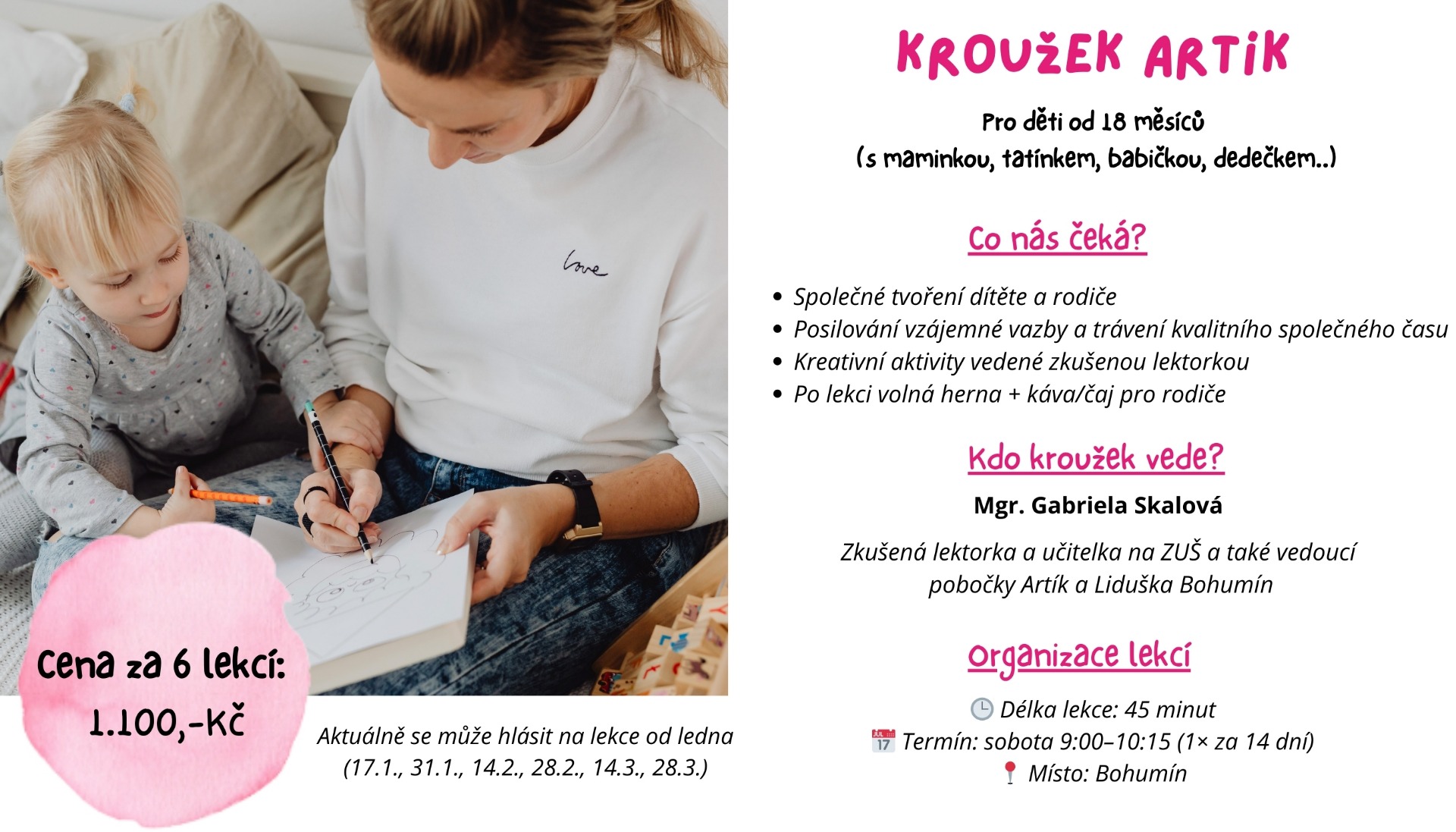 V uměleckých kroužcích se děti setkávají s aktivitami hudebními, dramatickými, pohybovými a výtvarnými. V lekcích procvičují a rozvíjejí: